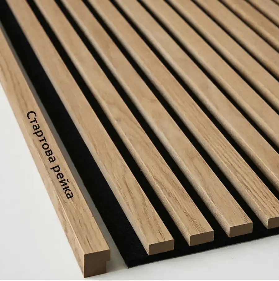 Рейки виготовлені з натурального шпону дуба та покриті олією Borma (Італія). У виробництві ми використовуємо тільки натуральні матеріали, щоб ви могли відчути справжнє дерево. Шпон дуба – це шар дерева, який приклеюється до основи з МДФ. Така структура рейки забезпечує ідеальну геометрію рейок.