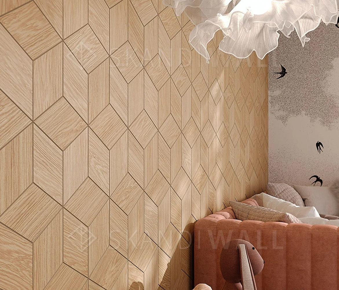 Rombus tiles are no more difficult to install than regular tiles. The peculiarity is that the individual elements (rhombuses) are laid out close to each other (without jointing). The rhombuses can be glued directly to the wall (wall preparation is the same as for wallpaper or tiles - the walls should be cleaned and primed). Wooden tiles can be easily cut with a hacksaw or circular saw.