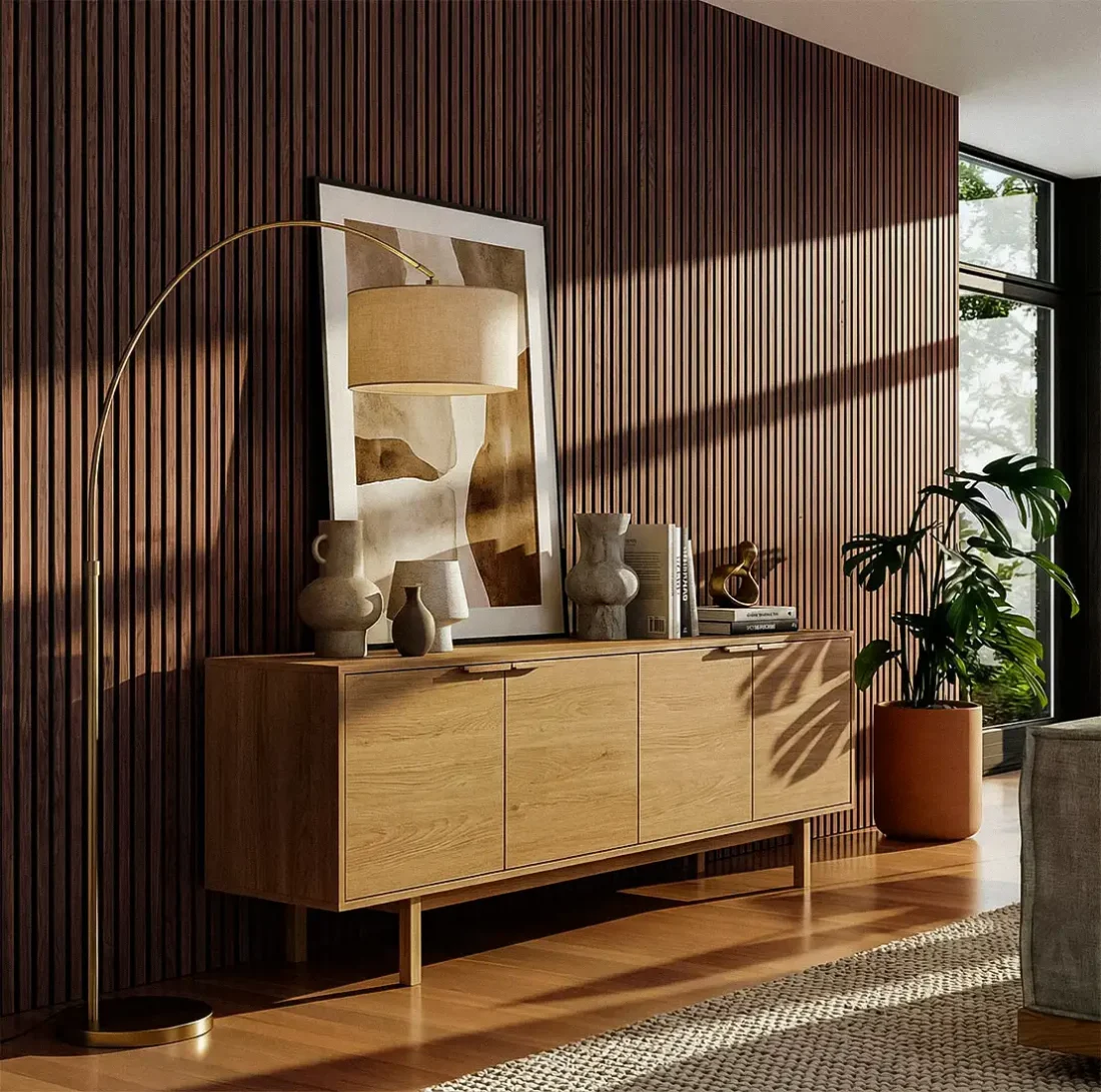 Slatted panels improve the acoustics in rooms - thanks to their three-dimensional 3D structure, they scatter sound waves (diffusion effect), reducing echoes and creating a more pleasant sound background.