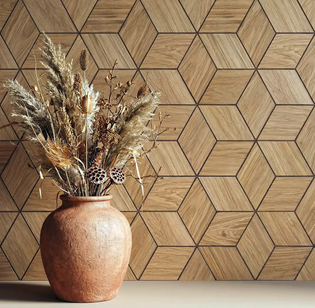 Деревянная плитка Rhombus создает элегантную геометрическую композицию из ромбов. Ромбы произведены из натурального шпона дуба, покрытого маслом-воском, чтобы подчеркнуть красоту дерева. Основа деревянной плитки - МДФ. Преимущество плитки Rhombus в том, что ее можно выкладывать в разных вариациях, кардинально меняя композицию и общий вид на стене. Объемная 3d фаска на ромбах эффектно подчеркивает геометрический узор.
