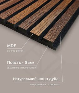 Рейки изготовлены из натурального шпона дуба и покрыты маслом Borma (Италия). В производстве мы используем только натуральные материалы, чтобы вы могли почувствовать настоящее дерево. Шпон дуба - это слой дерева, который приклеивается к основе из МДФ. Такая структура рейки обеспечивает идеальную геометрию реек.